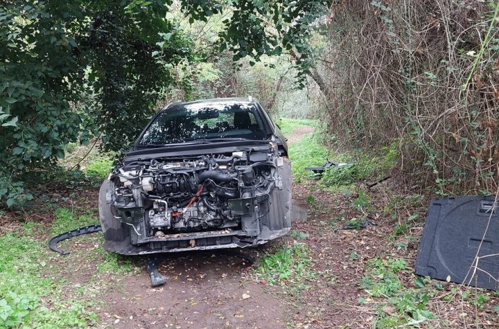 Un’auto cannibalizzata in un sentiero nella Riserva Valle dell’Aniene, a Città Giardino. Questo quanto...