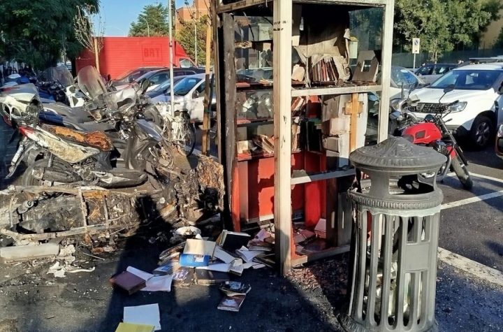 È bruciata insieme a due motorini e a gran parte dei libri che custodiva...